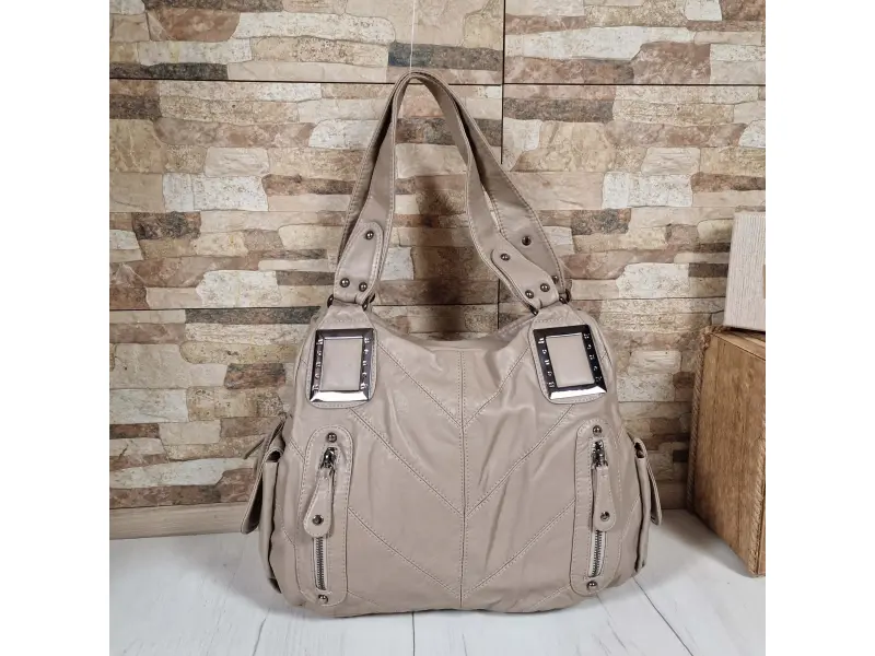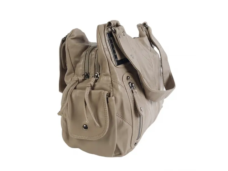 Άνετη τσάντα χειρός - Γυναικεία τσάντα χειρός από βρασμένο δέρμα. - Δύο κύριες θήκες με φερμουάρ. - Μικρή εσωτερική τσέπη με φερμουάρ. - Θήκες για τηλέφωνο και έγγραφα. - Δύο μπροστινές τσέπες με φερμουάρ. - Πίσω τσέπη με φερμουάρ. Δύο πλαϊνές τσέπες. - Άνετες λαβές μεταφοράς.