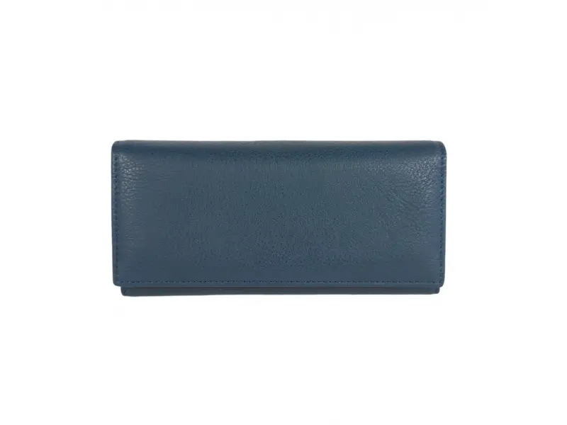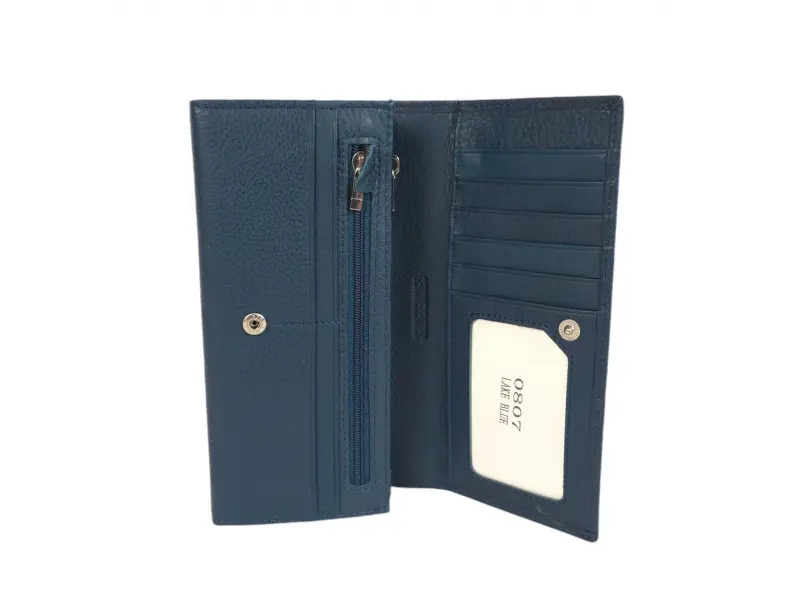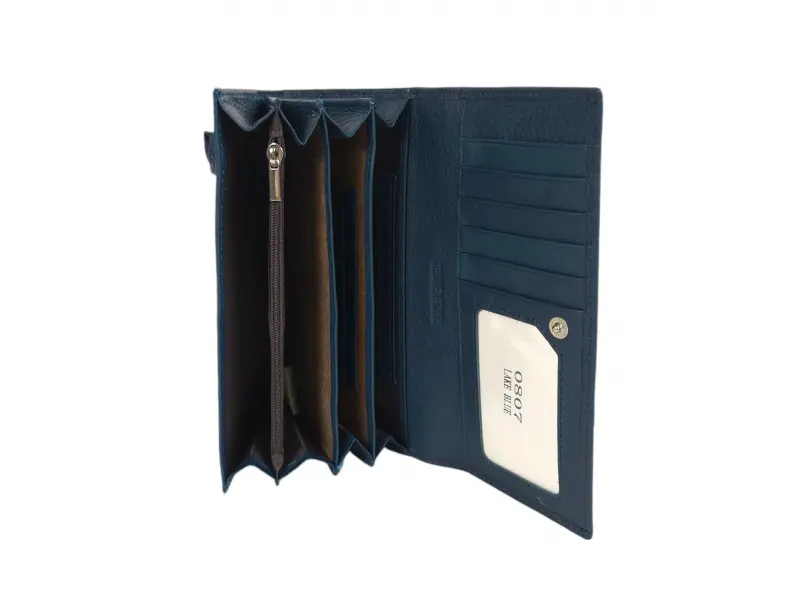 Γυναικεία τσάντα σε χρώμα μπλε της λίμνης - Γυναικεία τσάντα από γνήσιο δέρμα. - Κλείσιμο με κουμπί κλικ. - Θήκες για κάρτες. - Θέσεις για χαρτονομίσματα. Δύο θήκες με φερμουάρ.