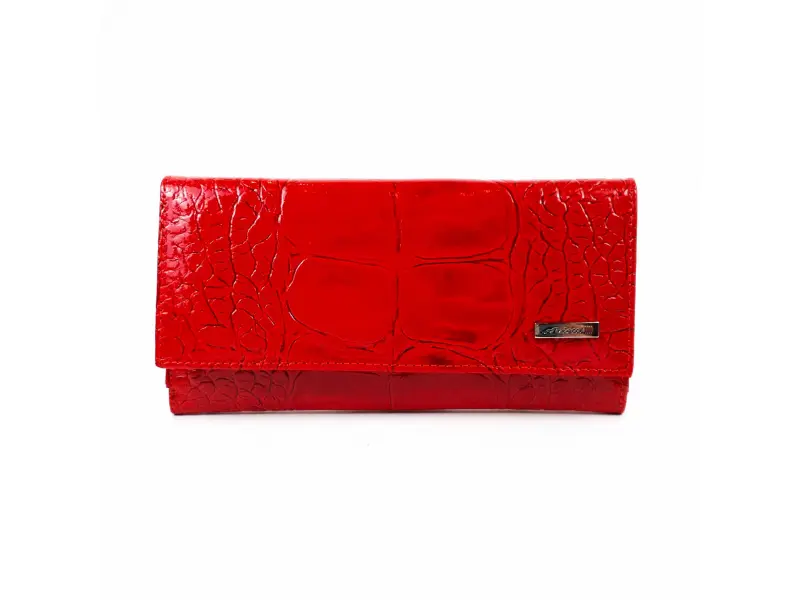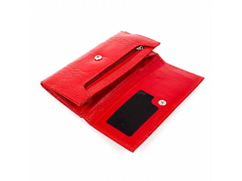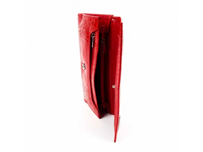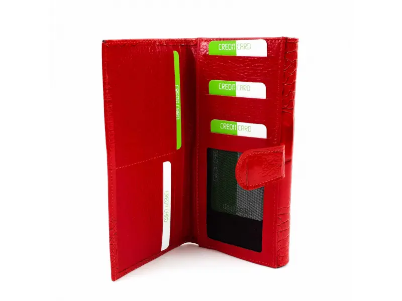 Γυναικείο πορτοφόλι υψηλής ποιότητας από δέρμα μοσχαριού, γνήσιο δέρμα και λουστρίνι. Κόκκινο πορτοφόλι με βολικό χώρο για χαρτονομίσματα, χώρο για κέρματα με φερμουάρ. Πολλές υποδοχές για τραπεζικές και επαγγελματικές κάρτες, προσωπικά έγγραφα στο πίσω μέρος του πορτοφολιού.
