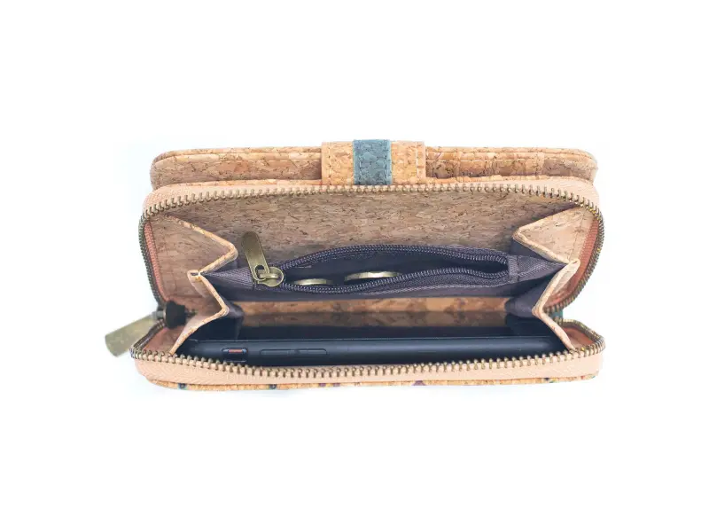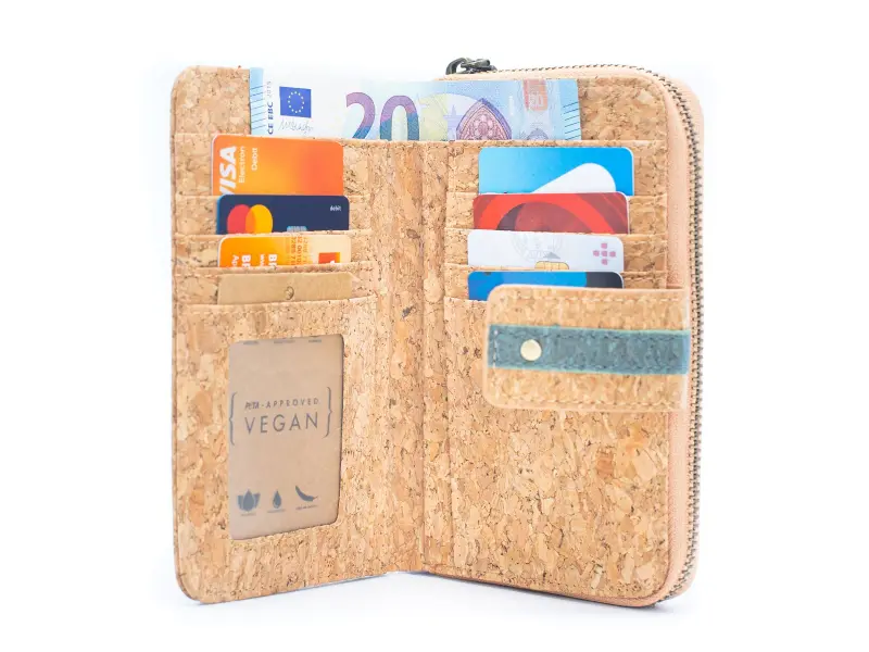 Μικρό γυναικείο πορτοφόλι με κούμπωμα από οικολογικό φελλό. Σχεδιαστικό πορτοφόλι με πολλές υποδοχές για κάρτες και έγγραφα, θήκη για χαρτονομίσματα και εξωτερική τσέπη για κέρματα με φερμουάρ.