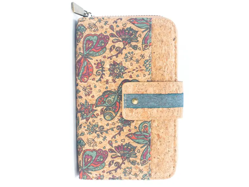 Πορτοφόλι από φελλό με λουλούδια και πεταλούδες Μικρό γυναικείο πορτοφόλι με κούμπωμα από οικολογικό φελλό. Σχεδιαστικό πορτοφόλι με πολλές υποδοχές για κάρτες και έγγραφα, θήκη για χαρτονομίσματα και εξωτερική τσέπη για κέρματα με φερμουάρ.