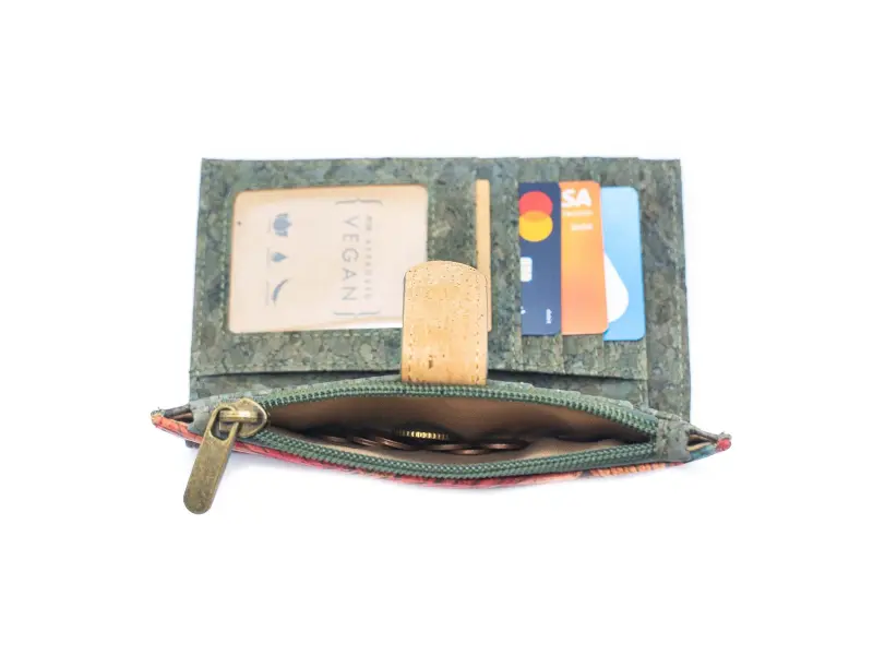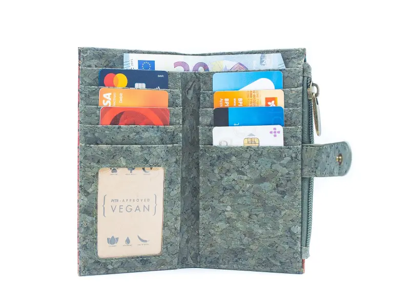 Ενδιαφέρον γυναικείο πορτοφόλι από οικολογικό, αδιάβροχο υλικό - φελλό. Γυναικείο πορτοφόλι υψηλής ποιότητας με κούμπωμα, υποδοχές για κάρτες και έγγραφα, θήκη για χαρτονομίσματα και εξωτερική τσέπη για κέρματα με φερμουάρ.