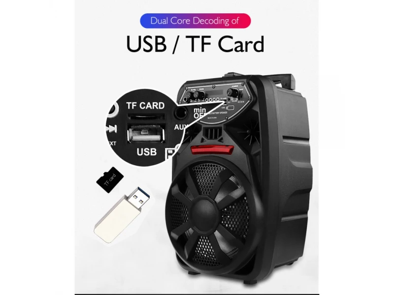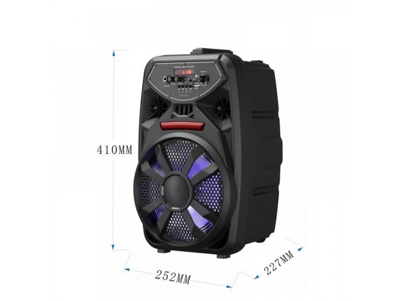 Φορητό Bluetooth ηχείο καραόκε PK-09 με ραδιόφωνο FM, MP3 και ασύρματο μικρόφωνο Το PK-09L είναι ένα εξαιρετικά ισχυρό ηχείο κατάλληλο για καραόκε, πάρτι, γάμους, εστιατόρια ή οικιακές συγκεντρώσεις. Εξοπλισμένο με ανθεκτική μπαταρία 2200 mAh, επιτρέπει την αναπαραγωγή μουσικής για ώρες χωρίς διακοπή. Το ηχείο έχει ενσωματωμένα φώτα που ενισχύουν την ατμόσφαιρα του πάρτι - μπορούν να σταματήσουν και να παίξουν. Είναι εξοπλισμένο με ρόδες και λαβή για ευκολότερη μετακίνηση. Μπορεί επίσης να συνδεθεί σε βάση ηχείων. Μπορεί να συνδεθεί με διάφορες συσκευές μέσω USB, Bluetooth, κάρτας SD/TF ή καλωδίου AUX. Το ηχείο διαθέτει ενσωματωμένο ραδιόφωνο FM. Το ηχείο είναι 8 ιντσών και παρέχει καλή ποιότητα ήχου και ένταση. Στο σετ περιλαμβάνεται μικρόφωνο, χάρη στο οποίο μπορείτε να κάνετε καραόκε, ώστε η διασκέδαση να ολοκληρωθεί! Τεχνικά χαρακτηριστικά: 1. Ισχύς εξόδου 10W 2. Συχνότητες από 20 Hz έως 20 KHz 3. Μπαταρία συσσωρευτή 3,7v, 2200mah 4. Ηχείο 8 ιντσών 5. Bluetooth, USB, κάρτα SD/TF, AUX 6. Μικρόφωνο 7. Καλώδιο φόρτισης 8. Οθόνη LED 9. Διαστάσεις: 26x22x42cm – Βάρος: 3 κιλά