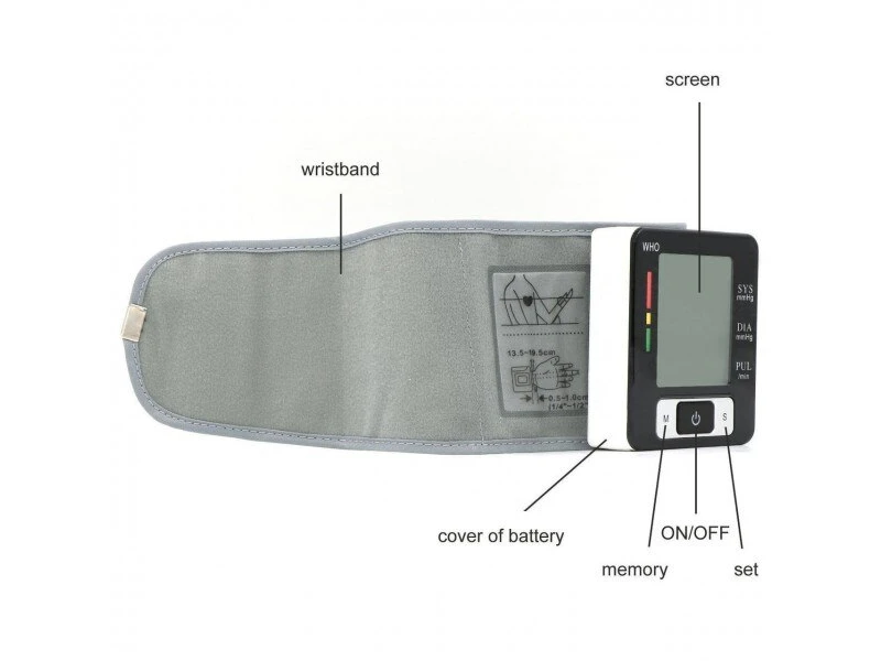 Αυτόματο ψηφιακό πιεσόμετρο καρπού με 2 θέσεις μνήμης και μέσο όρο αυτών. Μέτρηση κατά το φούσκωμα. Ενδείξεις: συστολική-διαστολική-σφυγμοί-πίεση σφυγμών αρρθυμία-ανίχνευση κίνησης κατά τη μέτρηση-ημερομηνία και ώρα μετρήσεων. Ελεγμένο και πιστοποιημένο σύμφωνα με τα Ευρωπαϊκά Πρότυπα (ΕSH) Ευρωπαϊκή Κοινότητα Υπέρτασης. Ιαπωνίας.Θερμοκρασία αποθήκευσης - 10-55 ° CΥγρασία αποθήκευσης RH 10% -85%Θερμοκρασία λειτουργίας 5-40 ° CΥγρασία λειτουργίας RH 5% -85%οθόνη Ψηφιακή οθόνη LCDΜέθοδος μέτρησης Ανάλυση παλμών / παλμογράφοΕύρος πίεσης 0-37.3kpa (0-280mmhg)Εύρος παλμών 40-199 φορές / λεπτόΕύρος εμφάνισης καρπού 0-39.9kpa (0-299mmhg)Στατική πίεση ± 0,4kpa (± 3mmhg)Ο παλμός Σε ± 5%Τάση 3 V.Παροχή ηλεκτρικού ρεύματος 2 * μπαταρία AAA Οι κύριες λειτουργίες * Δοκιμή αρτηριακής πίεσης και καρδιακού ρυθμού* Τροφοδοσία: 2 τεμάχια * AAA 3V* User 1 και User 2* 90 σετ μνήμης για 2 χρήστες* Ημερομηνία και ώρα προβολής* Διαγραφή όλων μνήμη ή να διαγράψετε μια ομάδα από τις λειτουργίες της μνήμης* mmHg / kkPa εναλλαγής* Ένδειξη χαμηλής τάσης μπαταρίας * Αυτόματος πληθωρισμός και αποπληθωρισμός* Μέγεθος προβολής οθόνης: 3,3 * 4,4 εκατοστά