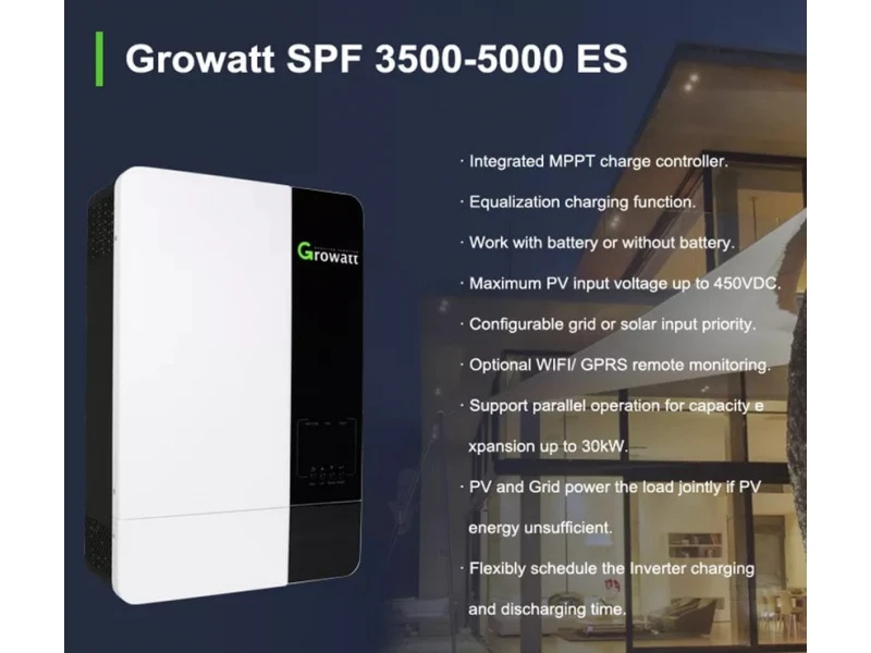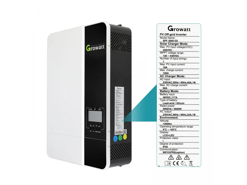 Ανακαλύψτε τον υβριδικό μονοφασικό μετατροπέα Growatt SPF 5000 ES 5kW. Ιδανικός για οικονομικά φωτοβολταϊκά συστήματα, προσφέρει αξιόπιστη τροφοδοσία με ισχύ έως 5kW, μέγιστη είσοδο 450V και υποστήριξη για μπαταρίες Li-Io-Po και γέλης. Ιδανική επιλογή για βιώσιμες ενεργειακές λύσεις!