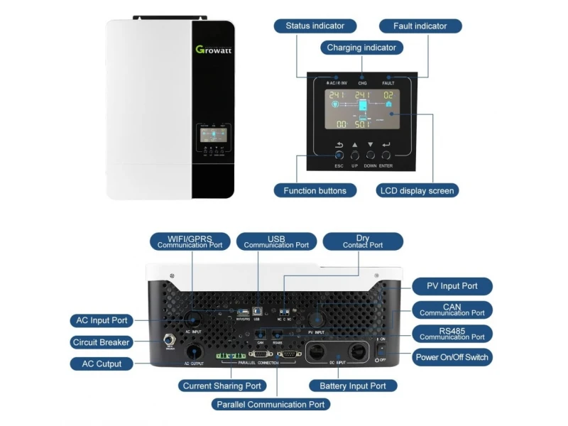Ηλιακός υβριδικός μονοφασικός μετατροπέας Growatt SPF 5000 ES 5kW με WiFi