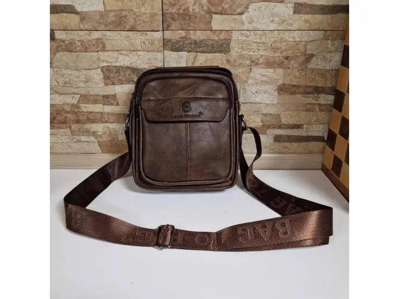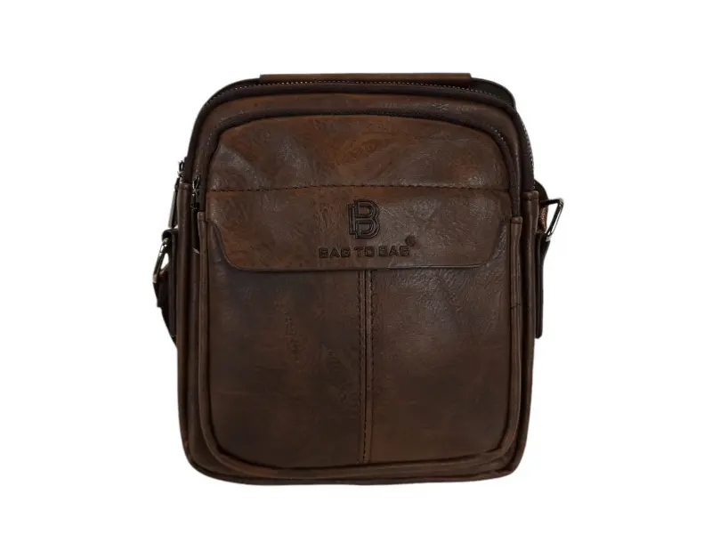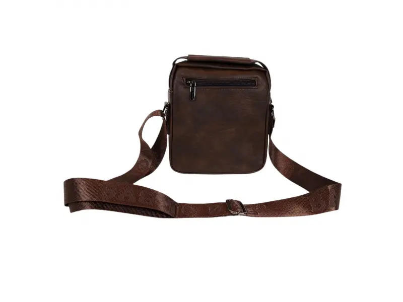 Ανδρική τσάντα από ποιοτικό οικολογικό δέρμα σε καφέ χρώμα. Άνετη τσάντα με μία κύρια θήκη με φερμουάρ, μικρή εσωτερική τσέπη με φερμουάρ, πίσω τσέπη με φερμουάρ και δύο μπροστινές τσέπες με φερμουάρ. Ανθεκτική ανδρική τσάντα με άνετη λαβή για μεταφορά στο χέρι και ρυθμιζόμενο λουράκι ώμου.