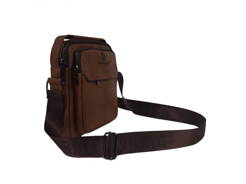 Μοντέρνα ανδρική τσάντα από ποιοτικό οικολογικό δέρμα. Πρακτική τσάντα με πολλές θήκες και ανθεκτικά φερμουάρ. Καφέ ανδρική τσάντα με μακριά ρυθμιζόμενη λαβή και άνετη λαβή για μεταφορά στο χέρι.