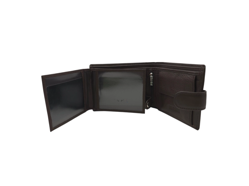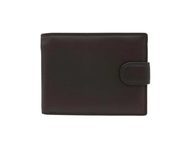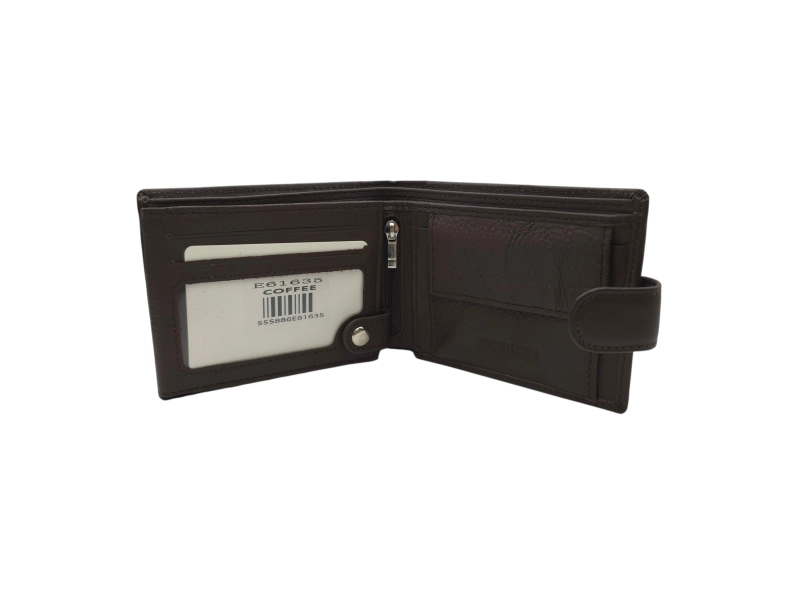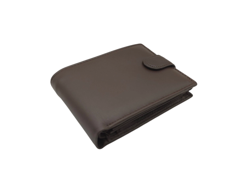 Ανδρικό πορτοφόλι από γνήσιο δέρμα υψηλής ποιότητας σε χαμηλή τιμή. Καφέ ανδρικό πορτοφόλι με κούμπωμα και βολικές θήκες για χαρτονομίσματα, κέρματα και προσωπικά έγγραφα.