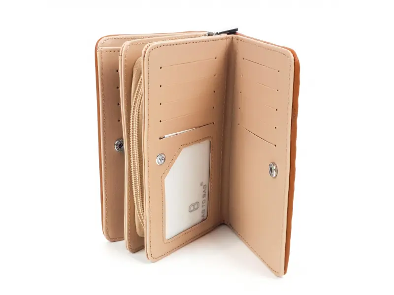 Γυναικείο πορτοφόλι μεσαίου μεγέθους από τεχνητό δέρμα. Καφέ πορτοφόλι με πολλές υποδοχές για έγγραφα, κάρτες και επαγγελματικές κάρτες, θήκη για χαρτονομίσματα και θήκη για κέρματα με φερμουάρ.