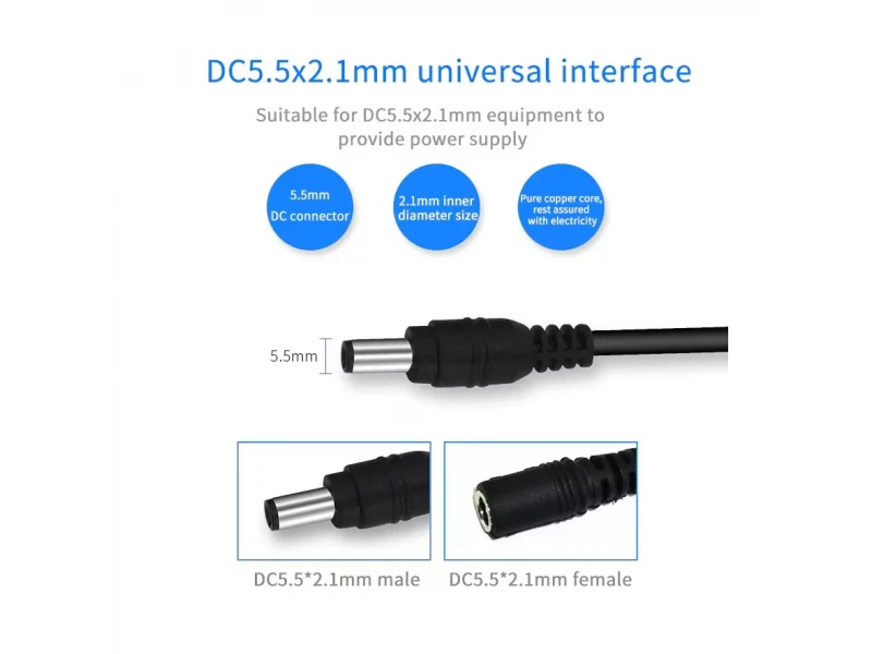Τυπικό καλώδιο επέκτασης για τροφοδοτικό 12V – το καλώδιο είναι κατάλληλο για όλους τους τύπους καμερών CCTV εξωτερικού χώρου από τη Robicam. Με ωτίδα/πρίζα καλωδίου αρσενικό και θηλυκό 5,5mm X 2,1mmΜήκος 5 μέτρα.Επέκταση καλωδίου, αυξάνοντας την απόσταση μεταξύ της πρίζας (220V) και της τροφοδοτούμενης συσκευής. Με αυτόν τον τρόπο, το τροφοδοτικό μπορεί να κρυφτεί σε εσωτερικούς χώρους όταν το τροφοδοτούμενο αντικείμενο εγκαθίσταται σε εξωτερικό χώρο.