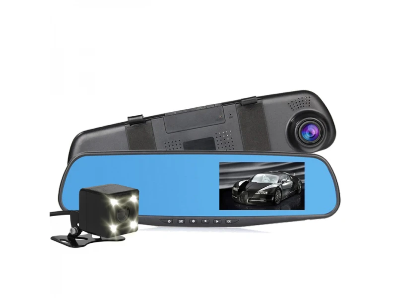 Εγγραφή βίντεο Καθρέφτης DVR με ενσωματωμένη μπαταρία για αυτοκίνητο με μπροστινή και πίσω κάμερα Κάμερα οπισθοπορείας. Κιτ διπλής κάμερας. 4 σε 1 - Εγγραφή βίντεο DVR, καθρέφτης, οθόνη TFT και κάμερα οπισθοπορείας. Τα πάντα για την οδική σας ασφάλεια σε μία συσκευή. Η κάμερα DVR είναι εξαιρετικά λειτουργική, με ανάλυση εγγραφής βίντεο Full HD 1080P 1920 x 1080, οθόνη LCD 4,3 ιντσών, υποδοχή κάρτας μνήμης SD και ενσωματωμένη μπαταρία Li-ion. Δυνατότητα λήψης βίντεο ή φωτογραφιών και από τις δύο κάμερες, που υποβοηθά το παρκάρισμα, λειτουργία ανίχνευσης κίνησης και μικρόφωνο για εγγραφή ήχου, που προστατεύει το όχημά σας. Η κάμερα καθρέφτη σάς επιτρέπει να βλέπετε ταυτόχρονα τι συμβαίνει μπροστά και πίσω από αυτό.   Ο καθρέφτης διαθέτει κάμερα οπισθοπορείας (Parking) και μπροστινή κάμερα που καταγράφει τι συμβαίνει μπροστά από το αυτοκίνητο (VCR). Χαρακτηριστικό: - Τύπος: καθρέφτης οπισθοπορείας + ενσωματωμένη οθόνη + ενσωματωμένη μπροστινή κάμερα + Περιλαμβάνεται πίσω εξωτερική κάμερα - Συμβατότητα: καθολικό προϊόν αυτοκινήτου - Δυνατότητα εγγραφής από τις 2 κάμερες ταυτόχρονα - Οθόνη: TFT LCD RGB έγχρωμη - Μέγεθος οθόνης: 4,3 ίντσες - Λόγος διαστάσεων: 16:9 - Συστήματα σήματος: PAL / NTSC - Μορφή φωτογραφίας: Φωτογραφίες JPEG - Ανάλυση φωτογραφίας: HD 2048X1536 - Μορφή βίντεο: βίντεο AVI - Ανάλυση βίντεο: FULL HD 1080P > Ανάλυση μπροστινής κάμερας: HD 1920*1080P, 1280*720P μπροστινή κάμερα: 170 μοίρες > πίσω κάμερα: 720*480P πίσω κάμερα: 140 μοίρες - Λειτουργία "Ανίχνευση κίνησης" - εγγραφή όταν ανιχνεύεται κίνηση από την πίσω κάμερα - Λειτουργία εικόνας σε εικόνα - Υποδοχή κάρτας micro μνήμης έως 32 GB - Αισθητήρας CMOS - Αισθητήρας G - Αυτόματος διακόπτης - αυτόματη ενεργοποίηση όταν μπαίνει η όπισθεν (κατά τη στάθμευση) - Εύκολη εγκατάσταση: κλιπ - Μπαταρία: 450mAh ενσωματωμένη επαναφορτιζόμενη - Κατανάλωση: 400mA ~ 600mA - Τροφοδοσία: DC 12/24V. - Διαστάσεις: 30,5 x 8,5 x 4 cm - Συνδέεται σε: DVD, VCD, βιντεοκάμερα και άλλες συσκευές βίντεο - Υποστηριζόμενες γλώσσες: Αγγλικά, Κινέζικα, Γαλλικά, Ρωσικά, Γερμανικά, Ιταλικά, Πορτογαλία. Το σετ περιλαμβάνει: - 1 τεμ. Ο καθρέφτης + ενσωματωμένη μπροστινή κάμερα - 1 τεμ. Κάμερα οπισθοπορείας - 1 τεμ. Καλώδιο σύνδεσης από περίπου
