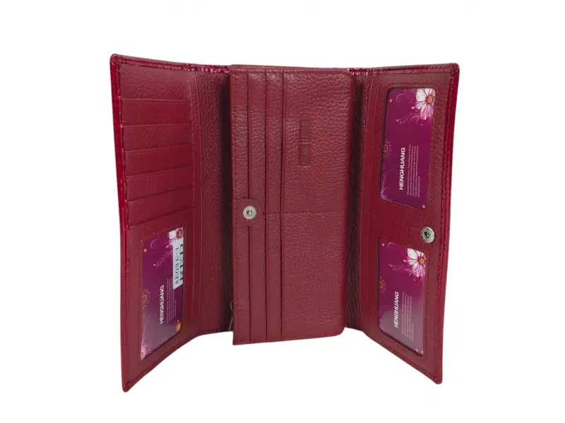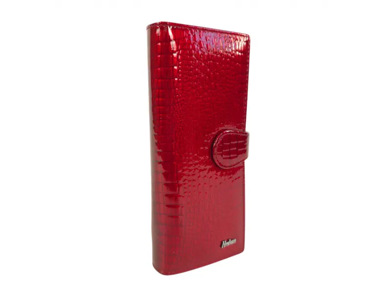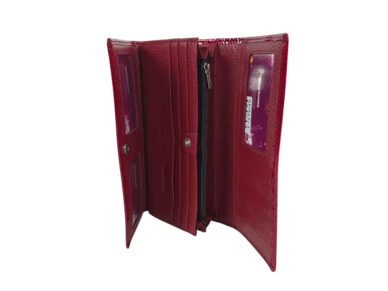 Κόκκινο γυναικείο πορτοφόλι από γνήσιο δέρμα και λουστρίνι. Κάθετο γυναικείο πορτοφόλι με θήκες για χαρτονομίσματα, υποδοχές για κάρτες και προσωπικά έγγραφα και θήκη για κέρματα με κλιπ φερμουάρ. Όμορφο γυναικείο πορτοφόλι με ενδιαφέρον σχέδιο.