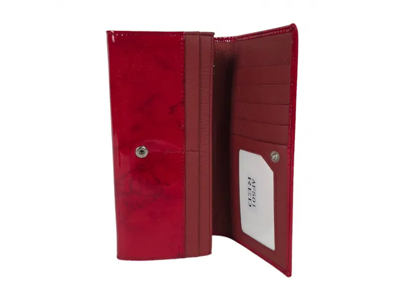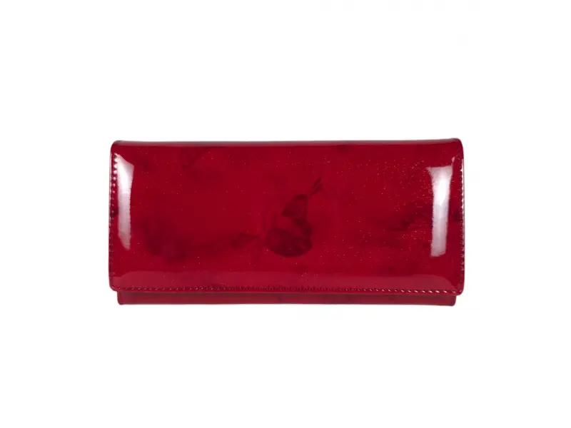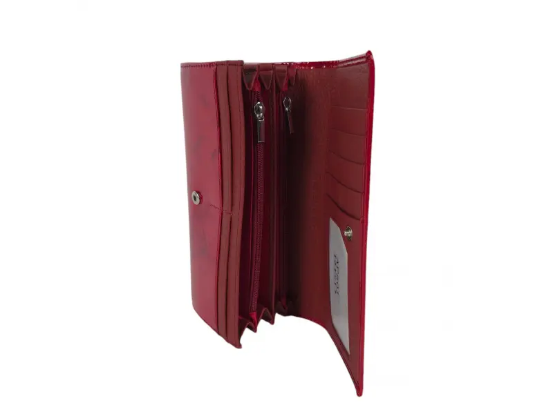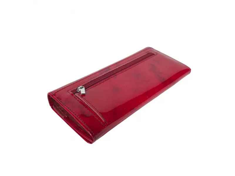 Κόκκινο γυναικείο πορτοφόλι από γνήσιο δέρμα και λουστρίνι. Μεγάλο γυναικείο πορτοφόλι με θήκες για χαρτονομίσματα, υποδοχές για κάρτες και ταυτότητες και θήκη για κέρματα με φερμουάρ. Κομψό γυναικείο πορτοφόλι με ενδιαφέρον σχέδιο.