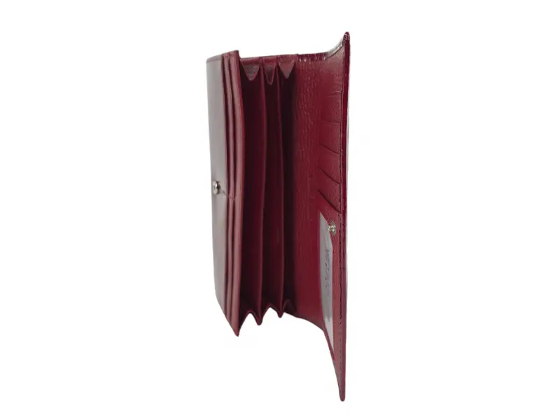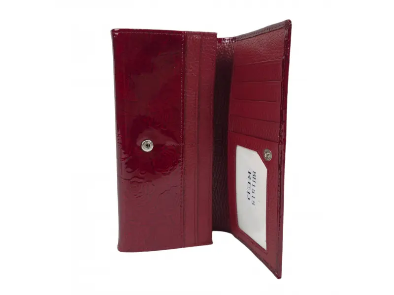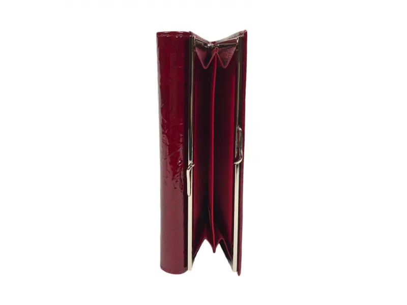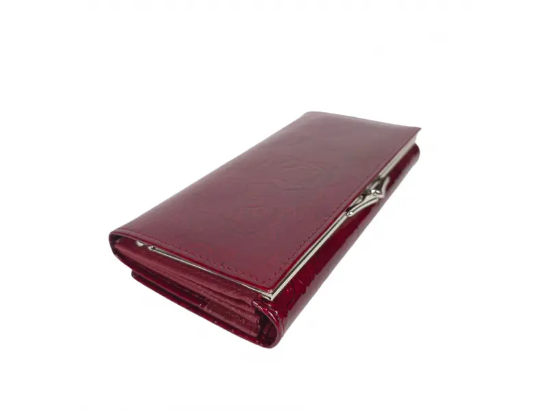Κόκκινο γυναικείο πορτοφόλι από γνήσιο δέρμα και λουστρίνι. Μεγάλο γυναικείο πορτοφόλι με θήκες για χαρτονομίσματα, υποδοχές για κάρτες και ταυτότητες και θήκη για κέρματα με φερμουάρ. Κομψό γυναικείο πορτοφόλι με ενδιαφέρον σχέδιο.