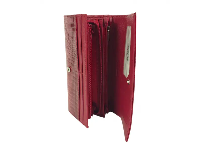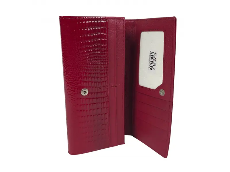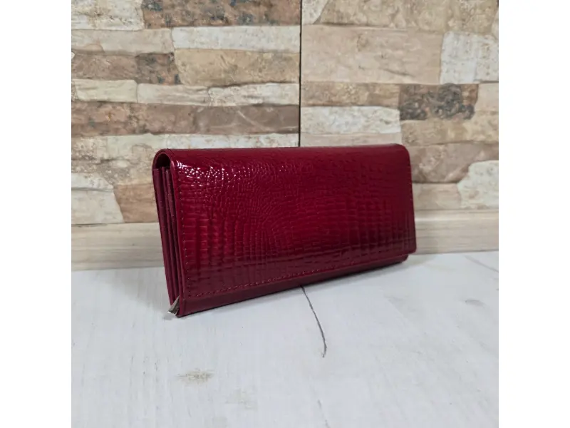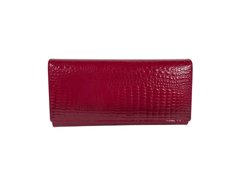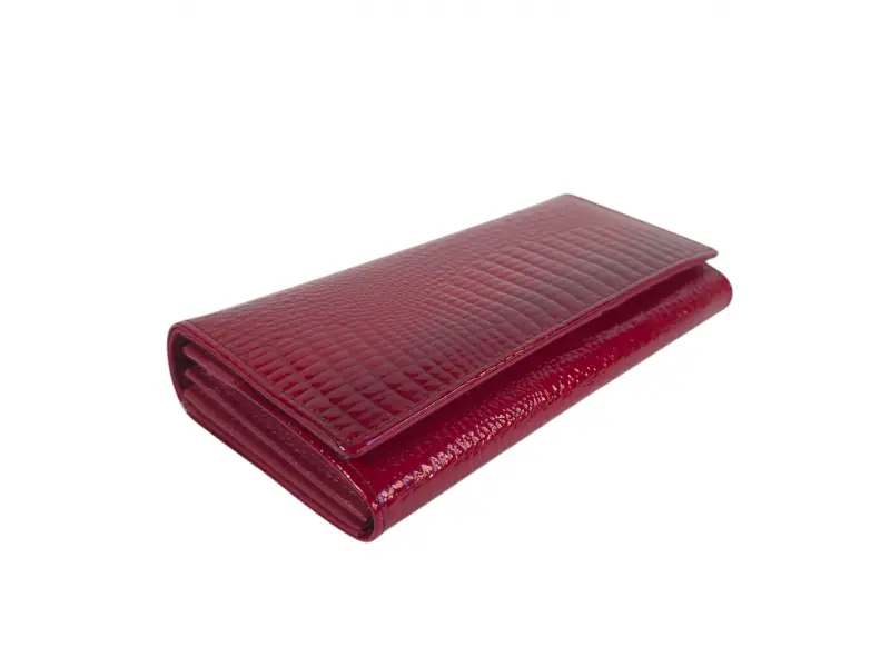 Κόκκινο γυναικείο πορτοφόλι από γνήσιο δέρμα και λουστρίνι. Μεγάλο γυναικείο πορτοφόλι με θήκες για χαρτονομίσματα, υποδοχές για κάρτες και προσωπικά έγγραφα και θήκη για κέρματα με φερμουάρ. Όμορφο γυναικείο πορτοφόλι με ενδιαφέρον σχέδιο.