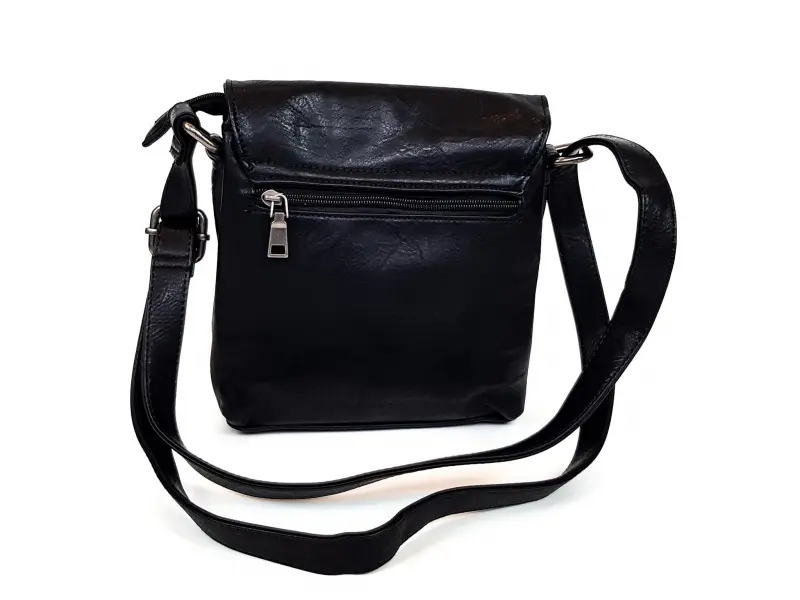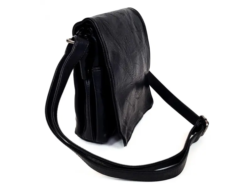 Υψηλής ποιότητας ανδρική τσάντα από οικολογικό δέρμα με καπάκι και βολική διάταξη. Μαύρη ανδρική τσάντα από ανθεκτικό τεχνητό δέρμα και στιβαρά φερμουάρ, μακριά ρυθμιζόμενη λαβή.