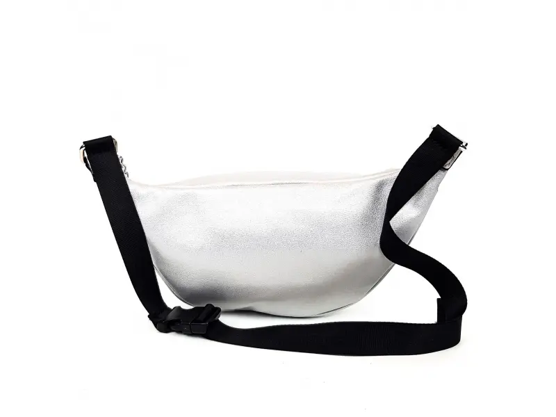 Γυναικεία τσάντα χιαστί υψηλής ποιότητας από συνθετικό δέρμα. Ασημένια τσάντα χιαστί με μεγάλο ασημί φερμουάρ και αλυσίδα. Ρυθμιζόμενη ζώνη από πολυεστέρα.