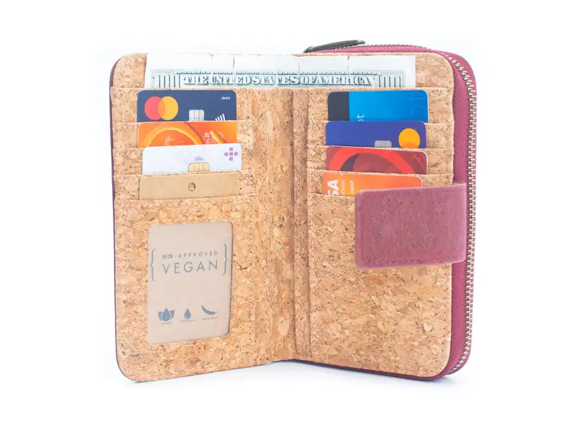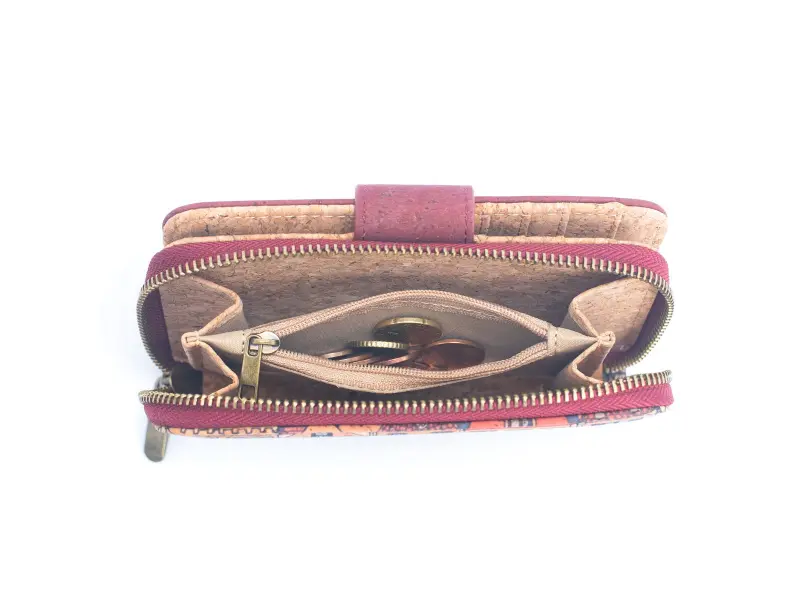 Γυναικείο πορτοφόλι υψηλής ποιότητας από οικολογικό υλικό - φελλό. Άνετο γυναικείο πορτοφόλι με κούμπωμα και εξωτερική τσέπη για κέρματα με φερμουάρ, θήκη για κέρματα και μικρή τσέπη για κέρματα με φερμουάρ, πολλές υποδοχές για κάρτες και έγγραφα και θήκη για χαρτονομίσματα.