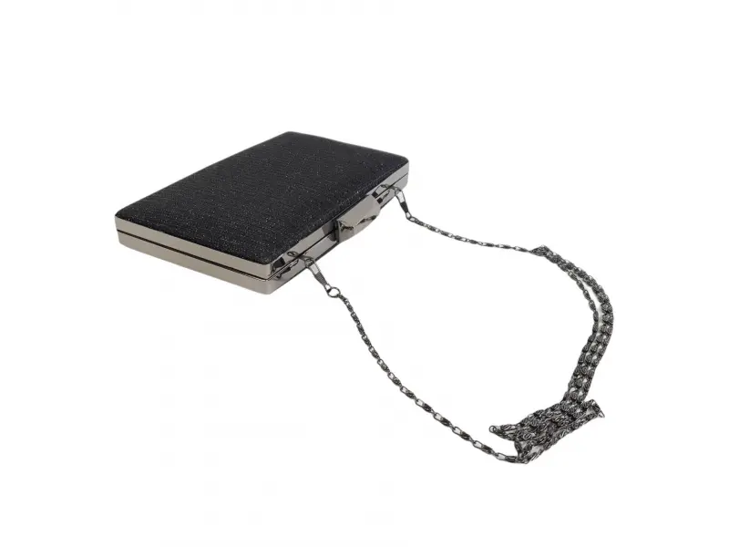 Μαύρη τσάντα με ένα άνοιγμα σε μία θήκη, μηχανισμό και μακριά λαβή τύπου αλυσίδας σε μεταλλικό χρώμα. Μια γυαλιστερή τσάντα κατάλληλη για χορό αποφοίτησης, γάμο ή ειδική εκδήλωση.