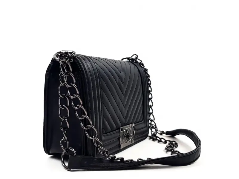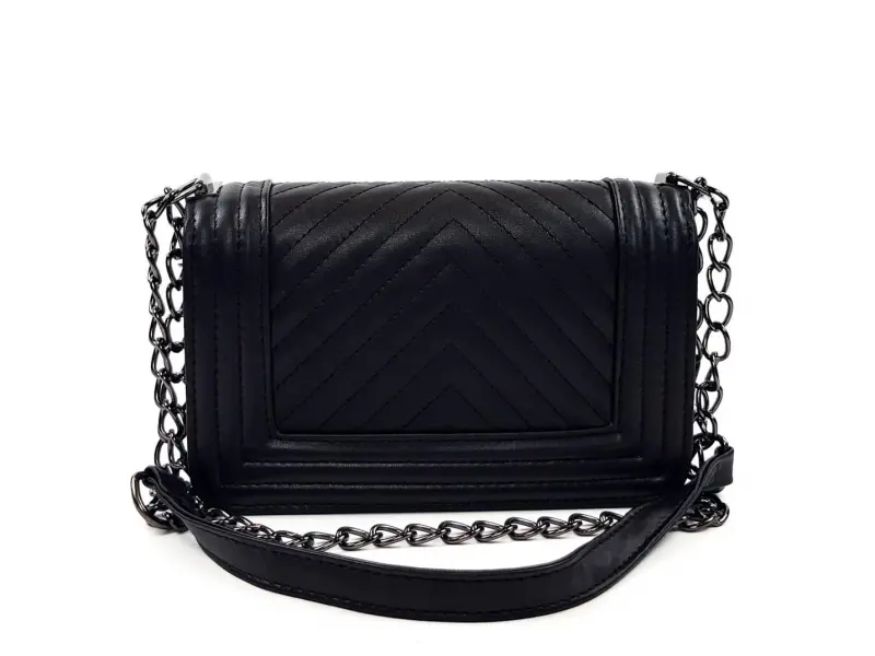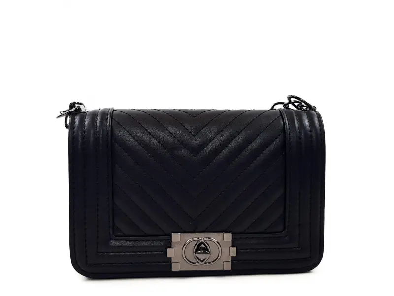 Υπέροχη γυναικεία τσάντα χειρός από οικολογικό δέρμα σε μαύρο χρώμα με μακριά λαβή τύπου αλυσίδας με ενδιαφέρον κούμπωμα και μία θήκη. Μικρή τσάντα χειρός από τεχνητό δέρμα.