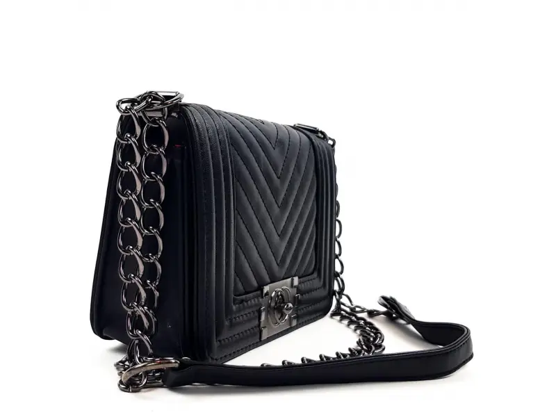 Κομψή γυναικεία τσάντα χειρός από οικολογικό δέρμα σε μαύρο χρώμα με μακριά λαβή τύπου αλυσίδας και τεχνητό δέρμα για άνεση στον ώμο. Μικρή τσάντα με ενδιαφέρον κούμπωμα και καπάκι και μία θήκη.