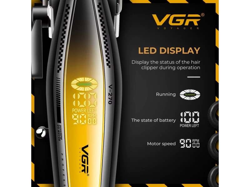 Κουρευτική μηχανή VGR V-270 με οθόνη LED, ισχυρό κινητήρα 9000 στροφών, διάρκεια ζωής μπαταρίας έως 250 λεπτά, φόρτιση USB-C και βάση. Ιδανική για επαγγελματική και οικιακή χρήση.