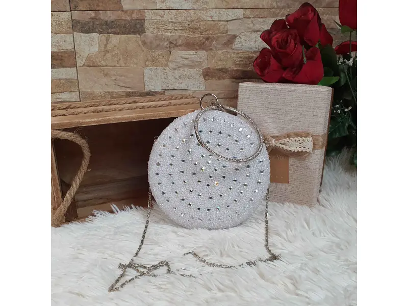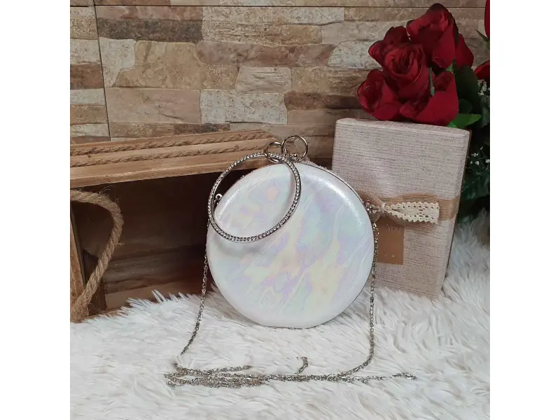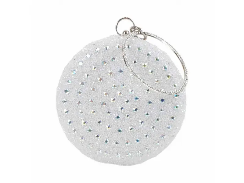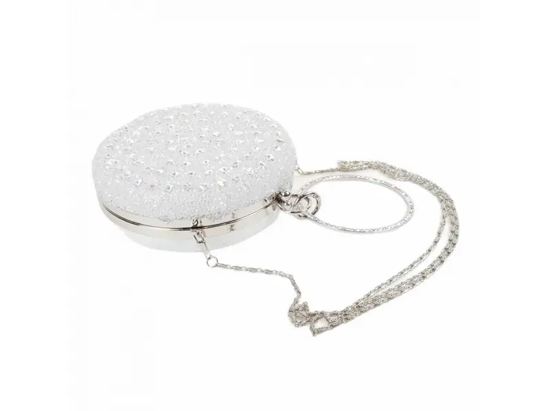 Λαμπερή στρογγυλή τσάντα χαμαιλέοντας. Στρογγυλή τσάντα χορού σε λευκό χρώμα με χαμαιλέοντα πίσω μέρος. Μοντέρνα επίσημη τσάντα με πέτρες κατάλληλη για χορό. - ePazar.bg