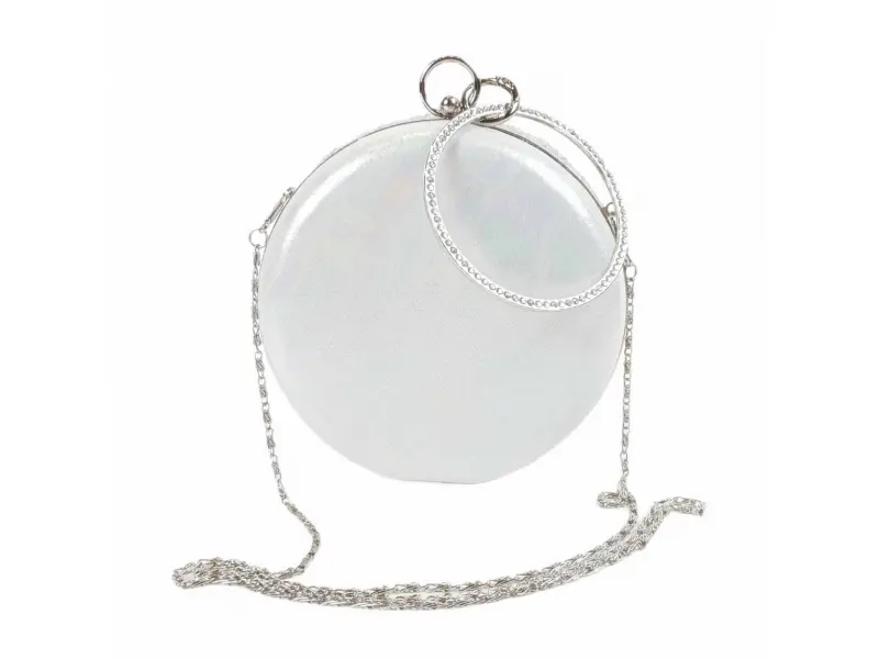 Λευκή γυαλιστερή στρογγυλή τσάντα με χαμαιλέοντα πίσω μέρος. Επίσημη τσάντα με μία θήκη και ασημί τελείωμα, μακριά λαβή με αλυσίδα και επιπλέον λουράκι χειρός. Γυναικεία τσάντα κατάλληλη για χορό.