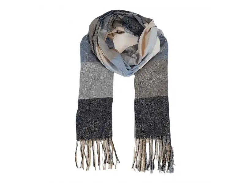 Μαλακό και άνετο γυναικείο φουλάρι με έναν ενδιαφέροντα συνδυασμό χρωμάτων. Το φουλάρι είναι κατασκευασμένο από συνδυασμό 70% βαμβακιού και 30% μεταλλικού νήματος.