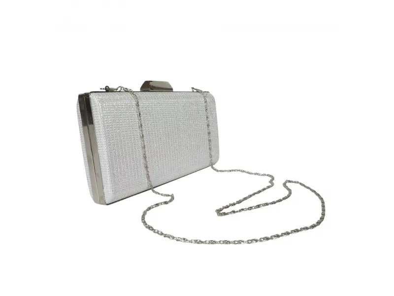 Κομψή τσάντα - Επίσημη τσάντα χειρός με μία θήκη. - Άνοιγμα και κλείσιμο με μηχανισμό. - Ασημένια μπορντούρα. - Λαβή τύπου μακριάς αλυσίδας.