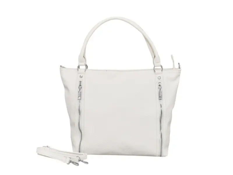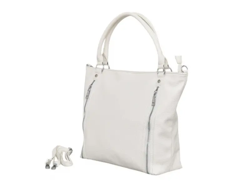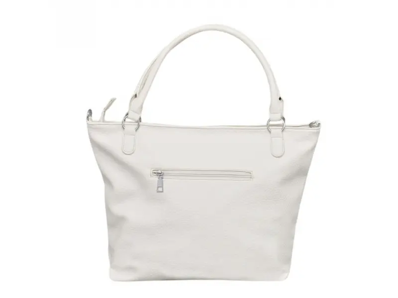 Μεγάλη τσάντα χειρός από ποιοτικό συνθετικό δέρμα. Καθημερινή τσάντα χειρός με πρακτικές θήκες και άνετους ιμάντες ώμου. Λευκή τσάντα χειρός με ενδιαφέρον σχέδιο.