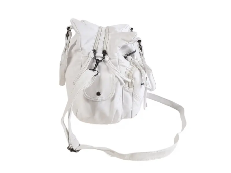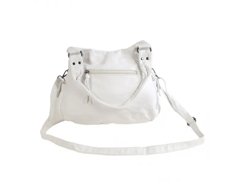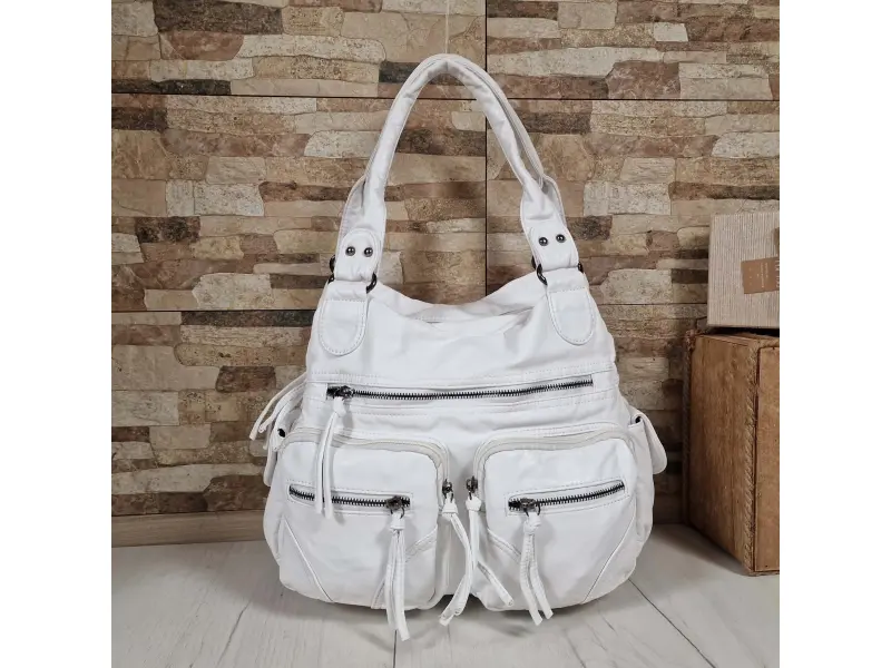Λευκή τσάντα χειρός - Γυναικεία τσάντα χειρός από βρασμένο δέρμα. - Δύο κύριες θήκες με φερμουάρ. - Μικρή εσωτερική τσέπη με φερμουάρ. - Θήκες για τηλέφωνο και έγγραφα. - Πέντε μπροστινές τσέπες με φερμουάρ. - Πίσω τσέπη με φερμουάρ. Δύο πλαϊνές τσέπες. - Άνετες λαβές μεταφοράς. - Μακριά ρυθμιζόμενη λαβή.