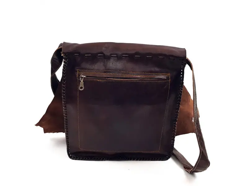 Χειροποίητη τσάντα από γνήσιο δέρμα, χειροποίητη στο Μαρόκο. Υπέροχο μοντέλο με φύλλο, κλείσιμο με δόντι, ενδιαφέρουσα τσάντα ώμου με μία μεγάλη θήκη και μια πίσω τσέπη που κλείνει με φερμουάρ, ρυθμιζόμενη μακριά δερμάτινη λαβή. Υπέροχη τσάντα για γνώστες.