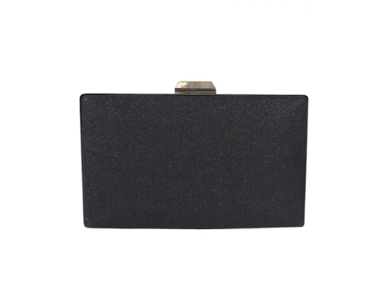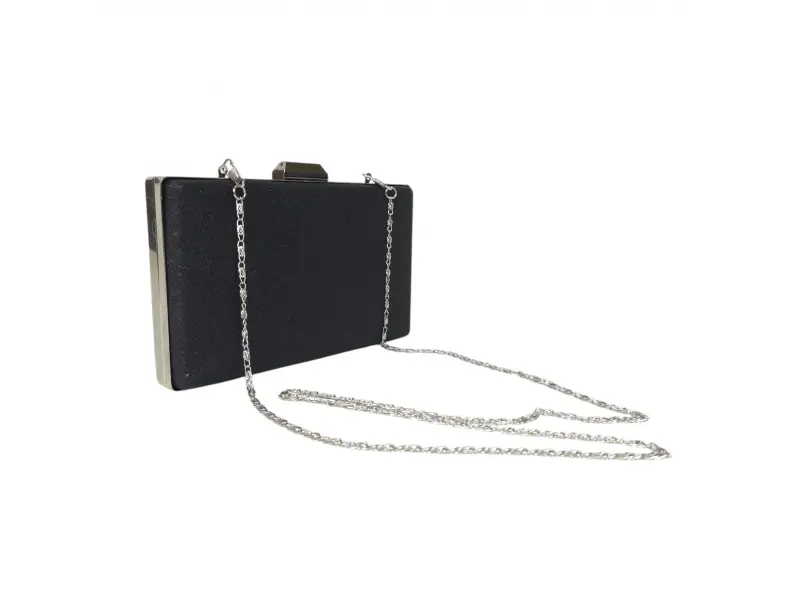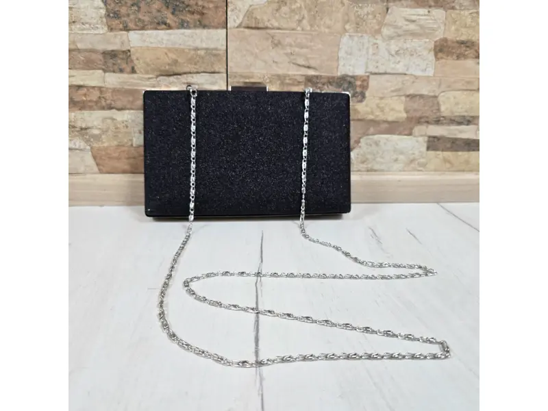 Μαύρη τσάντα με γκλίτερ - Επίσημη τσάντα χειρός με μία θήκη. - Άνοιγμα και κλείσιμο με μηχανισμό. - Ασημένια μπορντούρα. - Λαβή τύπου μακριάς αλυσίδας.