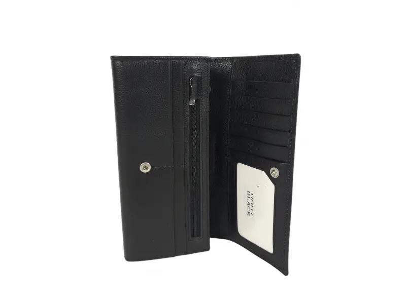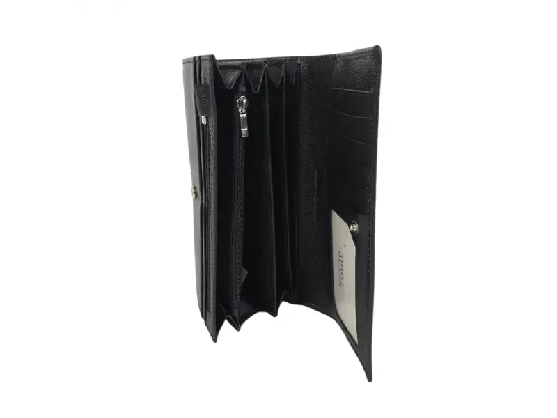Κλασικό μαύρο πορτοφόλι - Γυναικεία τσάντα από γνήσιο δέρμα. - Κλείσιμο με κουμπί κλικ. - Θήκες για κάρτες. - Θέσεις για χαρτονομίσματα. Δύο θήκες με φερμουάρ.