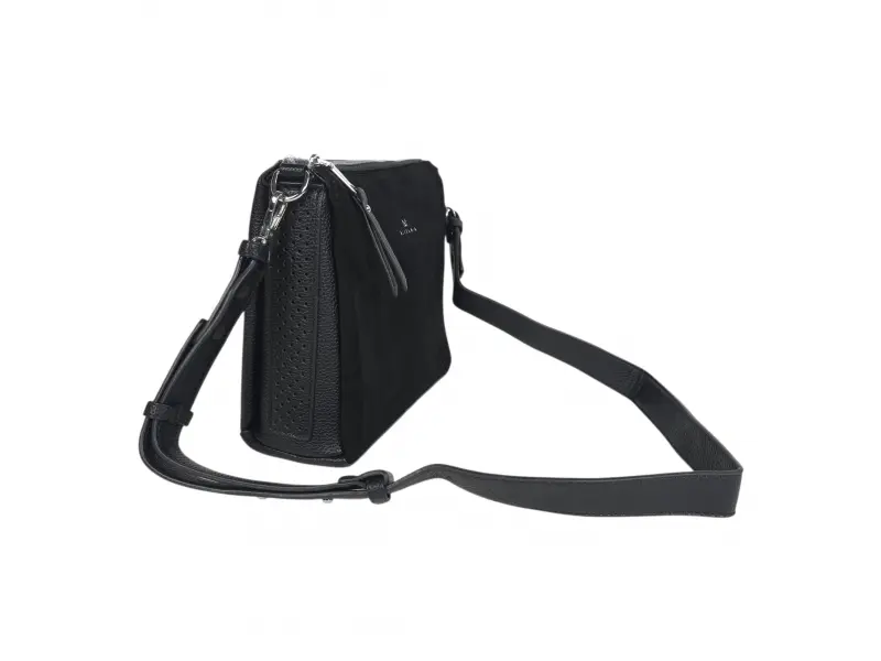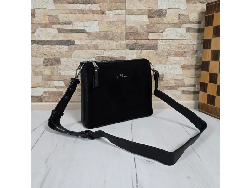 Μικρή τσάντα χειρός από ποιοτικό οικολογικό δέρμα και σουέτ. Άνετη τσάντα χειρός με ενδιαφέρον σχέδιο και άνετη μακριά ρυθμιζόμενη λαβή σε κλασικό μαύρο χρώμα.