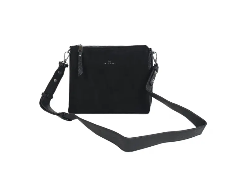 Μοντέρνα τσάντα χειρός σε μαύρο χρώμα - Μικρή τσάντα χειρός από οικολογικό δέρμα και σουέτ. - Τρεις κύριες θήκες που κλείνουν με ένα φερμουάρ. Εσωτερική τσέπη με φερμουάρ. - Θήκη για τηλέφωνο και έγγραφα. - Πίσω τσέπη με φερμουάρ. - Ρυθμιζόμενη μακριά λαβή.