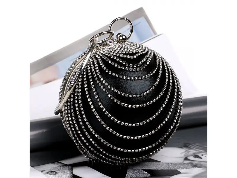 Σφαιρική τσάντα με πέτρες - Επίσημη τσάντα χειρός με μία θήκη. - Άνοιγμα και κλείσιμο με μηχανισμό. - Ασημένια μπορντούρα. - Λαβή για μεταφορά στο χέρι. - Λαβή τύπου μακριάς αλυσίδας.