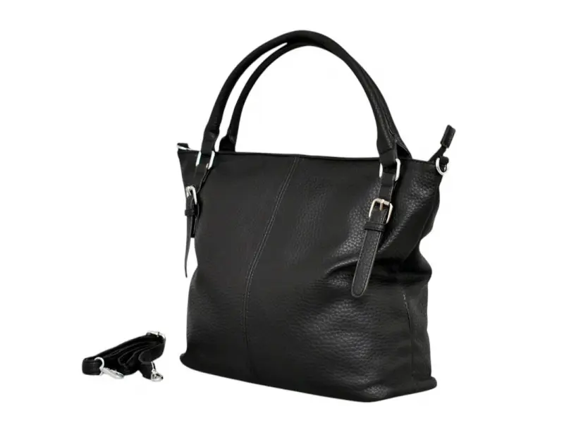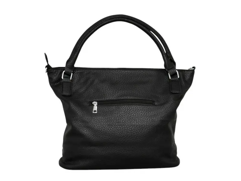 Μεγάλη τσάντα χειρός από ποιοτικό συνθετικό δέρμα. Καθημερινή τσάντα χειρός με πρακτικές θήκες και άνετους ιμάντες ώμου. Μαύρη τσάντα χειρός με ενδιαφέρον σχέδιο.