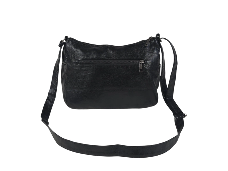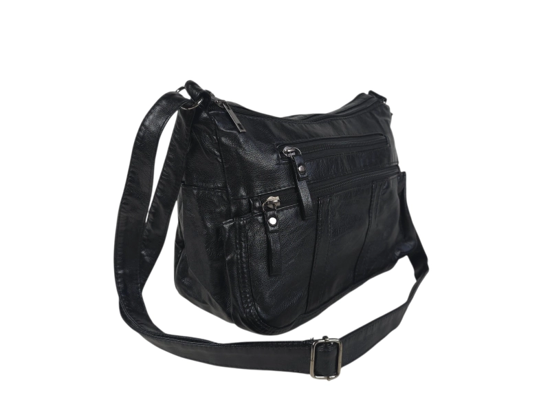 Μεσαίου μεγέθους τσάντα χειρός από απαλό συνθετικό δέρμα. Καθημερινή τσάντα ώμου με πολλές θήκες. Μαύρη τσάντα χειρός με ρυθμιζόμενη μακριά λαβή.