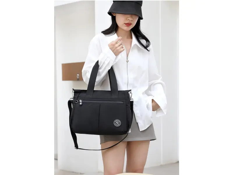 Άνετη τσάντα χειρός - Γυναικεία τσάντα χειρός από ύφασμα. - Μία κύρια θήκη με φερμουάρ. Μπροστινή τσέπη με φερμουάρ. Εσωτερική τσέπη με φερμουάρ. - Θήκη για τηλέφωνο και έγγραφα. Δύο πλαϊνές τσέπες. - Άνετες λαβές για μεταφορά στο χέρι. - Ρυθμιζόμενη, μακριά λαβή.
