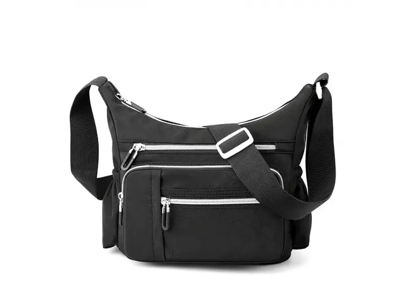 Μαύρη υφασμάτινη τσάντα χειρός για καθημερινή χρήση - Γυναικεία τσάντα χειρός από ύφασμα. - Μία κύρια θήκη με φερμουάρ. - Τρεις μπροστινές τσέπες με φερμουάρ. - Πίσω τσέπη με φερμουάρ. Δύο πλαϊνές τσέπες. - Μικρή εσωτερική τσέπη με φερμουάρ. - Θήκη για τηλέφωνο και έγγραφα. - Ρυθμιζόμενη, μακριά λαβή.