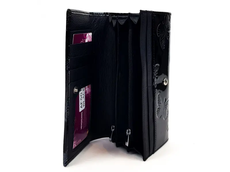 Γυναικείο πορτοφόλι από γνήσιο δέρμα και λουστρίνι, υπέροχο μοντέλο σε μαύρο χρώμα με πεταλούδες. Μεγάλο γυναικείο δερμάτινο πορτοφόλι με εξωτερική θήκη με φερμουάρ, εσωτερικές θήκες για χαρτονομίσματα και δύο θήκες με φερμουάρ, θήκες για κάρτες και θέση για έγγραφα. Η θέση των πεταλούδων μπορεί να είναι διαφορετική.