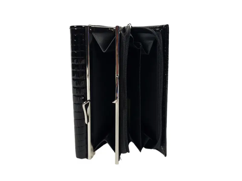 Γυναικείο πορτοφόλι μεσαίου μεγέθους από συνδυασμό λουστρίνι και γνήσιου δέρματος σε μαύρο χρώμα. Νέο μοντέλο πορτοφολιού με θήκες για κέρματα με φερμουάρ και κλιπ, χώρο για προσωπικά έγγραφα, υποδοχές για κάρτες, βολική διάταξη για χαρτονομίσματα.