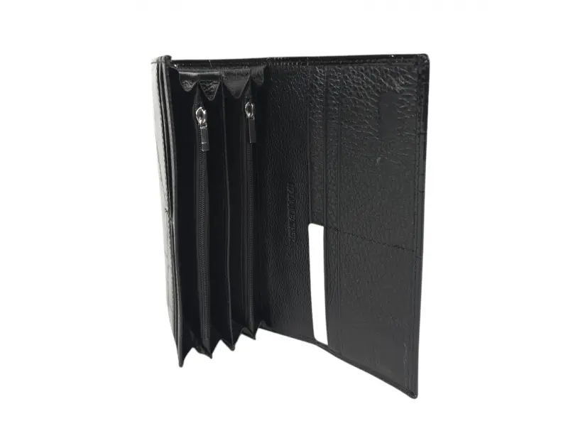 Μαύρο πορτοφόλι με μαγνητικό κλείσιμο - Γυναικεία τσάντα από γνήσιο δέρμα και λουστρίνι. - Θέσεις για χαρτονομίσματα. - Θέσεις για κάρτες και προσωπικά έγγραφα. - Θήκες για κέρματα με φερμουάρ. - Πίσω τσέπη με φερμουάρ.
