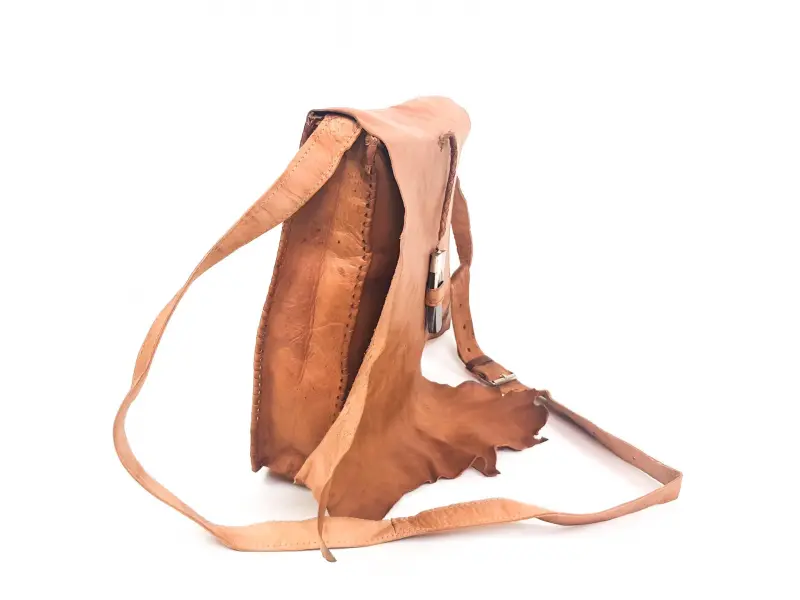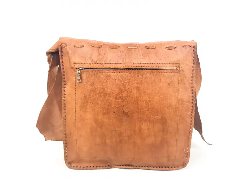 Τσάντα χειρός από γνήσιο δέρμα. Χειροποίητο δέρμα. Μια ενδιαφέρουσα τσάντα από το Μαρόκο σε ανοιχτό καφέ χρώμα. Ρυθμιζόμενη μακριά δερμάτινη λαβή. Κλείσιμο με καπάκι και δόντι. Μεγάλη θήκη με κλείσιμο με φερμουάρ. Θέσεις με φερμουάρ μπροστά και πίσω.