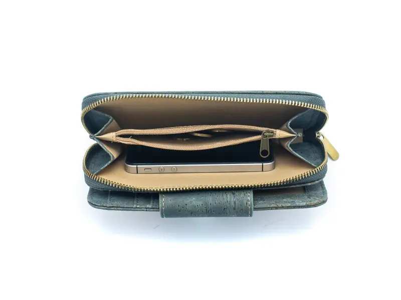 Γυναικείο πορτοφόλι υψηλής ποιότητας από οικολογικό υλικό - φελλό. Άνετο γυναικείο πορτοφόλι με κούμπωμα και εξωτερική τσέπη για κέρματα με φερμουάρ, θήκη για κέρματα και μικρή τσέπη για κέρματα με φερμουάρ, πολλές υποδοχές για κάρτες και έγγραφα και θήκη για χαρτονομίσματα.