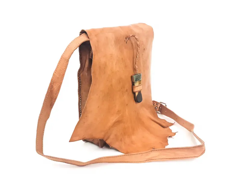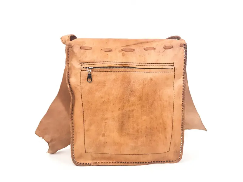 Τσάντα χειρός από γνήσιο δέρμα. Χειροποίητο δέρμα. Μια ενδιαφέρουσα τσάντα από το Μαρόκο σε ανοιχτό καφέ χρώμα. Ρυθμιζόμενη μακριά δερμάτινη λαβή. Κλείσιμο με καπάκι και δόντι. Μεγάλη θήκη με κλείσιμο με φερμουάρ. Θέσεις με φερμουάρ μπροστά και πίσω.