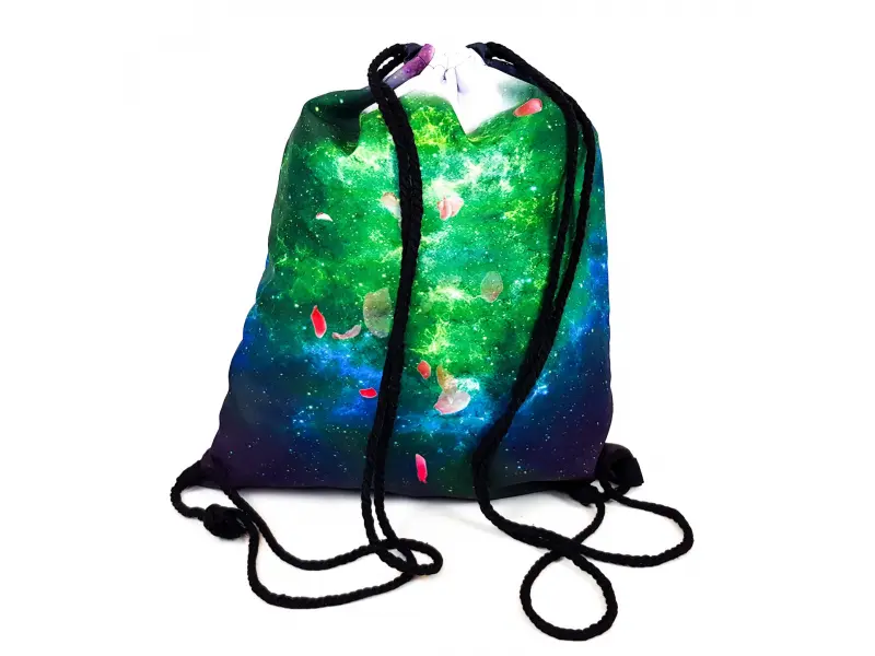 Ενδιαφέρουσα τσάντα με σχέδιο διαστήματος, αστέρια και φύλλα λουλουδιών. Σακίδιο πλάτης τύπου σάκου με μία θήκη, που δένει με λουράκια από σχοινί.